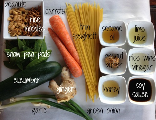 - Place cooked spaghetti, carrots, onion, cucumber and pea pods in a large bowl.
