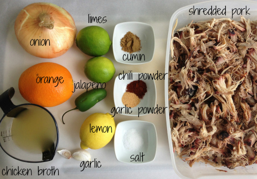If you do not have precooked pork. You can mix your spices with a tablespoon of oil and rub all over a 3 pound Boston Butt Roast. Place in crockpot and add onion, jalapeño garlic and fruit juices. Cover and cook for 8 hours on low. Remove and shred pork using two forks. Once shredded you can place on a baking sheet and cook in oven to crisp the meat as described above.