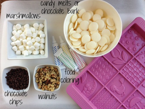 I looked in my baking drawer and found chocolate chips, marshmallows and walnuts. Thrown on top of the white chocolate to harden, it soon was a tasty Rocky Road Chocolate Bark!