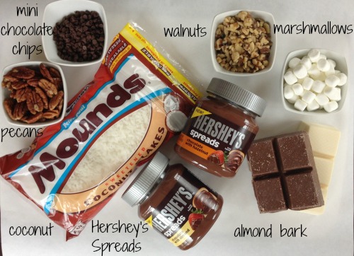 - Mix the coconut, pecans, chocolate chips and Hershey's Spread in a small bowl.
